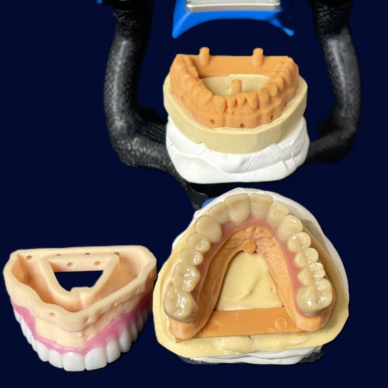 Bei optimalen Scandaten erfolgt die Gesamteinprobe als nächster Schritt. Hier kann direkt am Try-In eingeschliffen werden und Anzeichnungen für Veränderungen gemacht werden. Alle Änderungen werden direkt digital im Labor erfasst und umgesetzt.